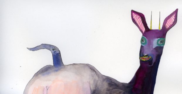 Jessie Mott’s watercolors of blues, yellows, and pinks bleeding into one another give her chimera-like drawings familiar qualities, even though the creatures themselves seem to exist in a universe very different from ours. As the lines between the human, the animal, and the sublime blur, the viewer cannot help but want to look beyond the surface and into the creatures’ eyes. And it is then that one eventually sympathizes with them. Despite their extraordinary colors, Mott’s imaginative “monsters” convey a sense of deep melancholy, coming from a need to be included, accepted, valued, and even loved. Unable to escape these human tendencies, they don’t look so monstrous anymore.